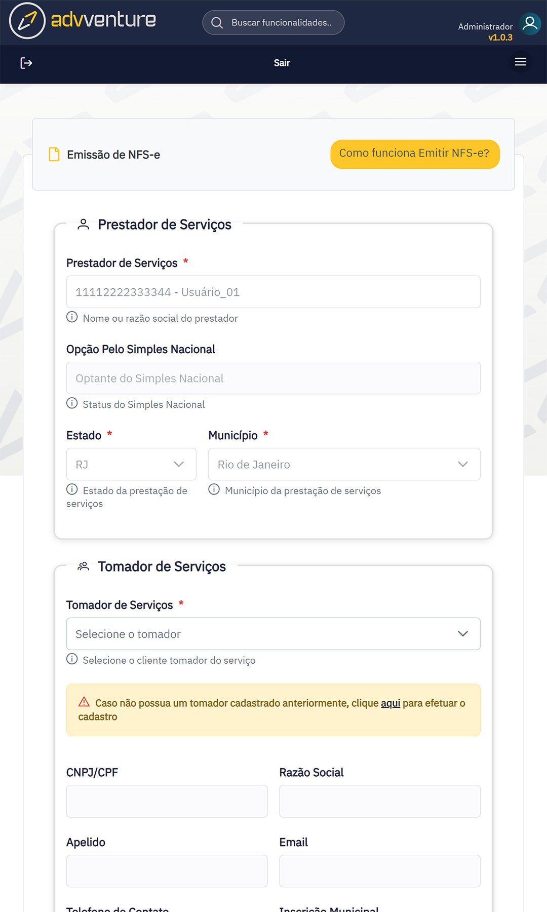 - Configuração fiscal inicial (regime e códigos de serviço)